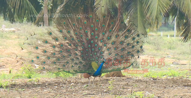 வானில் மேகம் கருத்திட, தன் மேனி சிலிர்த்திட, நீல மயில் தன் நீள தோகையை விரித்து அசைந்தாடும் ரம்மியமான காட்சி. (இடம்:- திருப்புல்லாணி அருகே நயினாமரைக்கான்)
