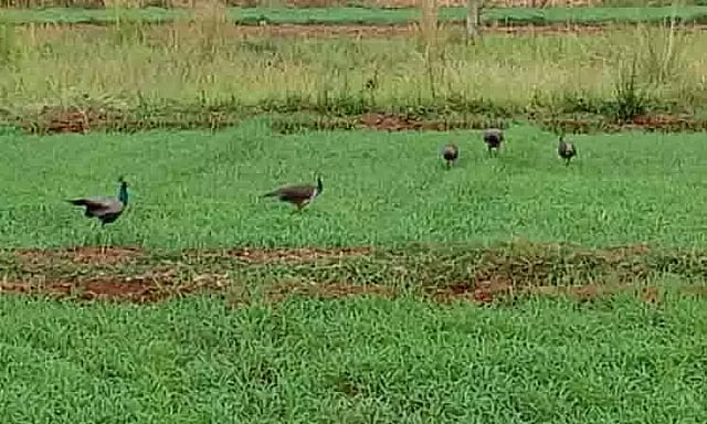 கரூ மாவட்டம், அரவக்குறிச்சியில் ஒரு வயலில் மாலை நேரத்தில் இரை தேடும் மயில்களை படத்தில் காணலாம்.
