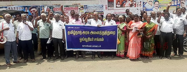சத்துணவு, அங்கன்வாடி, வருவாய் கிராம ஊழியர்கள், ஊராட்சி எழுத்தர்கள், வனத்துறை தொகுப்பூதிய ஊழியர்கள் மற்றும் கிராமபுற நூலகர்களுக்கு குறைந்தபட்ச ஓய்வூதியம் ரூ.7,850 வழங்க வேண்டும் என வலியுறுத்தி நேற்று நாமக்கல் பூங்கா சாலையில் தமிழ்நாடு அரசு அனைத்துத்துறை ஓய்வூதியர் சங்கம் சார்பில் ஆர்ப்பாட்டம் நடத்தப்பட்டது.