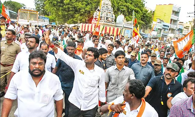 மதுரை மாவட்டம் உசிலம்பட்டி சட்டசபை தொகுதியில் என் மண், என் மக்கள் பாதயாத்திரையை பா.ஜனதா மாநில தலைவர் அண்ணாமலை நேற்று மாலை தொடங்கினார். கொங்கப்பட்டி பகுதியில் இருந்து வழி நெடுகிலும் மேளதாளங்கள் முழங்க அவருக்கு வரவேற்பு அளிக்கப்பட்டது. உசிலம்பட்டி பஸ் நிலைய பகுதியில் உள்ள தேவர் சிலைக்கும், மூக்கையா தேவர் சிலைக்கும் மாலை அணிவித்து மரியாதை செலுத்தினார்.