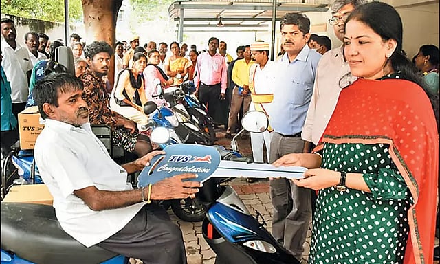 மக்கள் குறைதீர்க்கும் நாள் கூட்டத்தில், மாற்றுத்திறனாளிகள் நலத்துறை சார்பில், 4 மாற்றுத்திறனாளி பயனாளிகளுக்கு ரூ.3.34 லட்சம் மதிப்பிலான இணைப்பு சக்கரம் பொருத்தப்பட்ட பெட்ரோல் ஸ்கூட்டர்களும், 1 மாற்றுத்திறனாளி பயனாளிக்கு ரூ.1 லட்சத்து 6 ஆயிரம் மதிப்பிலான முதுகு தண்டுவடத்தால் பாதிக்கப்பட்டோருக்கான இணைப்பு சக்கரம் பொருத்தப்பட்ட பெட்ரோல் ஸ்கூட்டரும், 5 மாற்றுத்திறனாளி பயனாளிகளுக்கு ரூ.34 ஆயிரத்து 200 மதிப்பிலான தையல் எந்திரத்தையும் கலெக்டர் வழங்கினார்.