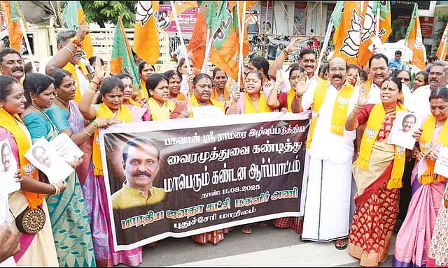 சமீபத்தில் நடந்த திமுக எம்.பி. ஜெகத்ரட்சகன் புத்தக வெளியீட்டு விழாவில் கலந்து கொண்ட கவிஞர் வைரமுத்து இந்துக்கள் போற்றி வணங்கும் பகவான் ஸ்ரீ ராமரை அவதூறாக பேசியிருப்பது கண்டனத்திற்குரியது. ஆழ்வார்கள் ஆய்வு மையம் நிறுவி வைணவ பக்தியைப் பரப்புவதாகக் கூறுவது மட்டுமன்றி, கம்பராமாயணத்தையும் ஆய்வு செய்து கொண்டிருப்பதாகச் சொல்கிற திமுக எம்.பி. ஜெகத்ரட்சகனும், ராமர் கோவில் கட்டுவதற்காக நிதி கொடுத்தோமென பெருமையாகக் கூறும் முதல்-அமைச்சர் மு.க.ஸ்டாலினும்ம் வைரமுத்துவின் இத்தகைய இந்துவிரோதப் போக்கை ஆமோதிக்கிறார்களா?.