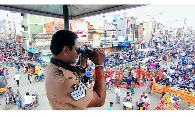 தீபாவளி பண்டிகையை முன்னிட்டு வேலூரில் அசம்பாவித சம்பவங்கள் நடைபெறாமல் இருக்க போலீசார் பாதுகாப்பு பணியில் ஈடுபட்டு வருகின்றனர். பொதுமக்கள் அதிகமாக கூடும் லாங்கு பஜாரில் காவலர் ஒருவர் உயர் கோபுரத்தின் மேல் நின்று பைனாக்குலர் மூலம் கூட்டத்தை கண்காணித்த காட்சி.