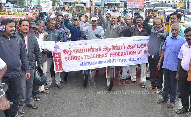 கிருஷ்ணகிரியில் இந்திய பள்ளி ஆசிரியர் கூட்டமைப்பு சார்பில் கோரிக்கைகளை வலியுறுத்தி இருசக்கர வாகன ஊர்வலம் நடந்தது. இதன் தொடக்க நிகழ்ச்சிக்கு மாவட்ட ஒருங்கிணைப்பாளர் பெருமாள்சாமி தலைமை தாங்கினார். தமிழ்நாடு முதுநிலை பட்டதாரி ஆசிரியர் கழக மாநிலத்துணைத் தலைவர் திருநாவுக்கரசு, மாவட்ட மகளிர் பிரிவு செயலாளர் சூசன்பெட்ரியியா, மாநில துணைச்செயலாளர் சுப்பிரமணியன், முன்னாள் மாவட்ட தலைவர் தானப்பன் ஆகியோர் முன்னிலை வகித்தனர். மாவட்ட செயலாளர் சிவா வரவேற்றார். தமிழ்நாடு அரசு முதுநிலை பட்டதாரி ஆசிரியர் கழக மாநில அமைப்புச் செயலாளர் நாராயணன், மாநில தணிக்கையாளர் ராமமூர்த்தி, நிர்வாகிகள் தங்கதுரை, ஜெகதீசன், ராஜேஸ்குமார், கார்த்திக்ராஜா, ஈஸ்வரி, மாநில துணைச் செயலாளர் சந்திரசேகரன், மாதப்பன் ஆகியோர் கோரிக்கைகளை வலியுறுத்தி பேசினர்.. முடிவில் மாவட்ட பொருளாளர் வெங்கடேசன் நன்றி கூறினார். இந்த ஊர்வலம் கிருஷ்ணகிரி புதிய பஸ் நிலையத்தில் தொடங்கி, காந்தி சிலை வழியாக அரசு ஆண்கள் மேல்நிலைப்பள்ளியை சென்றடைந்தது. அப்போது பல்வேறு கோரிக்கைகளை மத்திய, மாநில அரசுகள் நிறைவேற்ற வலியுறுத்தி கோஷங்கள் எழுப்பினர்.