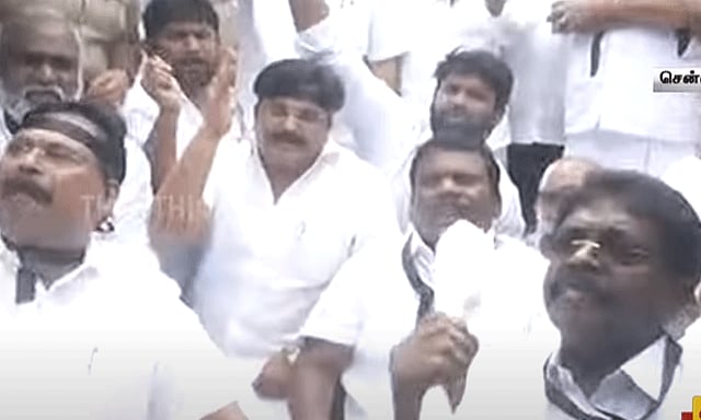 சட்டசபை காங்கிரஸ் தலைவர் செல்வப் பெருந்தகை தலைமையில் வெளியேறிய அவர்கள் தலைமை செயலகம் எதிரே உள்ள சாலையில் அமர்ந்து மறியலில் ஈடுபட்டனர்.