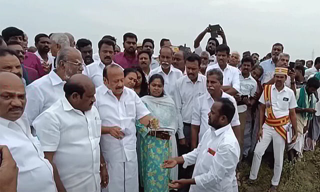 கனமழை காரணமாக டெல்டா மாவட்டங்களில் விளைநிலங்களில் மழைநீர் தேங்கி பயிர்கள் சேதமடைந்துள்ளன. இந்த நிலையில், தஞ்சாவூர் மாவட்டம் அம்மாபேட்டை அருகே உள்ள உக்கடை, புத்தூர் உள்ளிட்ட பகுதிகளில் மழையால் பாதிக்கப்பட்ட பயிர்களை தமிழக அரசின் வேளாண்துறை அமைச்சர் எம்.ஆர்.கே.பன்னீர்செல்வம் மற்றும் உயர்கல்வித்துறை அமைச்சர் கோவி.செழியன் ஆகியோர் இன்று நேரில் ஆய்வு செய்தனர்.