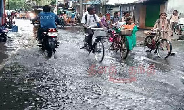 விருதுநகரில் நேற்று மாலை பெய்த மழைக்கு பழைய அருப்புக்கோட்டை சாலையில் ஓடிய மழைநீரில் பள்ளி மாணவ-மாணவிகள் சிரமத்துடன் சென்று வந்தனர்.