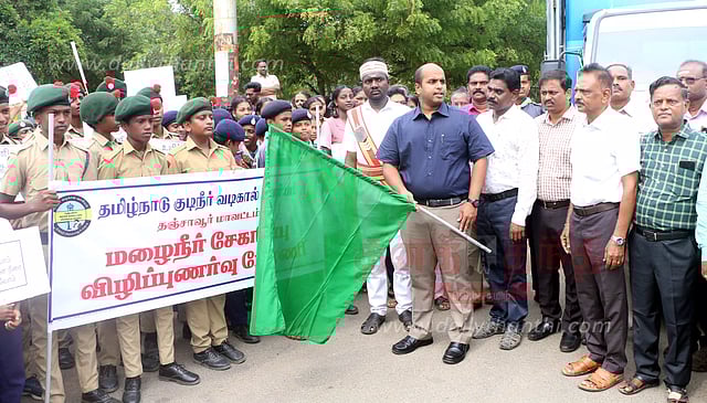 தமிழ்நாடு குடிநீர் வடிகால் வாரியத்தின் சார்பில் மழைநீர் சேகரிப்பு விழிப்புணர்வு ஊர்வலம் தஞ்சையில் நேற்று நடைபெற்றது. தஞ்சை ரெயில் நிலையம் அருகே இருந்து ஊர்வலத்தை கலெக்டர் தீபக்ஜேக்கப் கொடியசைத்து தொடங்கி வைத்தார். மேலும் செய்தி மக்கள் தொடர்புத் துறையின் அதிநவீன மின்னணு வீடியோ வாகனத்தில் நீர்பாதுகாப்பு" என்ற நோக்கத்தின் அடிப்படையாக கொண்டு தமிழ்நாடு குடிநீர் வடிகால் வாரியத்தின் சார்பில் மழைநீர் சேகரிப்பு விழிப்புணர்வு பிரசார வாகனத்தினையும் அவர் தொடங்கி வைத்தார்.