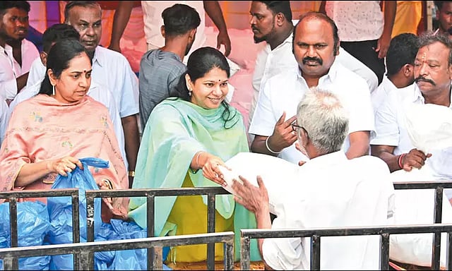 'மிக்ஜம்' புயல் மழை வெள்ளத்தால் பாதிக்கப்பட்ட மக்களுக்கு தி.மு.க. சார்பில் நிவாரண உதவிகள் வழங்கப்படுகின்றன. அதன்படி சென்னை மயிலாப்பூர் பிருந்தாவன் தெருவில் வசிக்கும் 1,000 குடும்பங்களுக்கு தி.மு.க. மேற்கு பகுதி 121-வது வட்டம் சார்பில் தலா 10 கிலோ அரிசி, மளிகை சாமான்கள் உள்பட நிவாரண பொருட்கள் வழங்கும் நிகழ்ச்சி நேற்று நடைபெற்றது. இதில் தி.மு.க. துணை பொதுச்செயலாளர் கனிமொழி எம்.பி. கலந்துகொண்டு நிவாரண உதவிகளை வழங்கினார்.