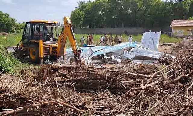 நிலத்தை ஒப்படைக்காததால் கரூர் வருவாய் கோட்டாட்சியர் ரூபினா தலைமையில் போலீசார் பாதுகாப்புடன் அப்பகுதிக்கு சென்ற அதிகாரிகள் பொக்லைன் எந்திரம் உதவியுடன் ஆக்கிரமிப்புகளை அகற்றி நிலத்தை மீட்டு வேலை அமைத்தனர்.