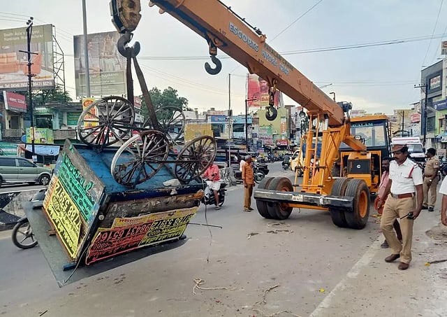 தேனி நகர் கம்பம் சாலையில் கொட்டக்குடி ஆற்றுப்பாலம் அருகில் சாலையோரம் போக்குவரத்துக்கு இடையூறாக தள்ளுவண்டிகளும், பெட்டிக்கடைகளும் இருந்தன. கடந்த 3 ஆண்டுகளாக அந்த கடைகள், தள்ளுவண்டிகள் எந்த பயன்பாடும் இன்றி, போக்குவரத்துக்கு இடையூறாக நிறுத்தி வைக்கப்பட்டு இருந்தன. இதனால், அந்த பகுதியை மதுப்பிரியர்கள் திறந்தவெளி மதுபான பார் ஆக பயன்படுத்தி வந்தனர். மேலும் திறந்தவெளி கழிப்பிடமாகவும் அப்பகுதி மாறியதால் சுகாதாரக்கேடு ஏற்பட்டது. மதுப்பிரியர்கள் மது குடித்துவிட்டு அங்கு நிறுத்தப்படும் இருசக்கர வாகனங்களை சேதப்படுத்திய சம்பவங்களும் நடந்தன. இதனால், எந்த பயன்பாடும் இன்றி போக்குவரத்துக்கும், பொதுமக்களுக்கும் இடையூறாக இருந்த தள்ளுவண்டிகள், பெட்டிக்கடைகளை அகற்ற வேண்டும் என்று மக்கள் கோரிக்கை விடுத்தனர். இதையடுத்து தேனி போக்குவரத்து போலீஸ் இன்ஸ்பெக்டர் தட்சிணாமூர்த்தி தலைமையில் நேற்று அங்கு ஆக்கிரமிப்புகளை அகற்றும் பணி நடந்தது. இந்த பணியை போலீஸ் துணை சூப்பிரண்டு பார்த்திபன் பார்வையிட்டார். நீண்டகாலமாக பயன்பாடு இன்றி கிடந்த தள்ளுவண்டி கடைகள், பெட்டிக்கடைகள் அங்கிருந்து கிரேன் உதவியுடன் அகற்றப்பட்டன.