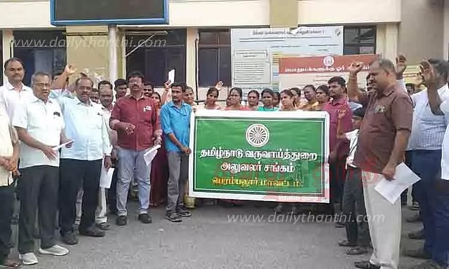 பெரம்பலூர் மாவட்ட தமிழ்நாடு வருவாய்த்துறை அலுவலர் சங்கத்தினர் நேற்று மாலை கண்டன ஆர்ப்பாட்டத்தில் ஈடுபட்டனர். பெரம்பலூர் மாவட்ட கலெக்டர் அலுவலக வளாகத்தில் நடந்த இந்த ஆர்ப்பாட்டத்திற்கு சங்கத்தின் மாவட்ட செயலாளர் சரவணன் தலைமை தாங்கினார். சங்கத்தின் மத்திய செயற்குழு உறுப்பினர் பாரதிவளவன், மாவட்ட பொருளாளர் குமரி அனந்தன் உள்ளிட்டோர் முன்னிலை வகித்தனர். இதில் சங்கத்தின் மாநில பொதுச்செயலாளர் சங்கரலிங்கம் கோரிக்கைகள் குறித்து விளக்கி பேசினார்.