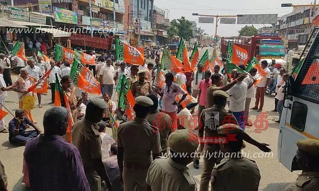 ஆனால் அவர்கள் கலைந்து செல்ல மறுத்தனர். உடனே அவர்களை போலீசார் கைது செய்ய முயன்றனர். இதனால் போலீசாருக்கும், பா.ஜ.க.வினருக்கும் இடையே தள்ளுமுள்ளு ஏற்பட்டது. இதன் காரணமாக அங்கு பரபரப்பு நிலவியது. பின்னர் போலீசாரின் கடும் எச்சரிக்கைக்கு பிறகு பா.ஜ.க.வினர் கலைந்து சென்றனர். இதனால் அந்த சாலையில் சுமார் அரை மணி நேரம் போக்குவரத்து பாதிக்கப்பட்டது.