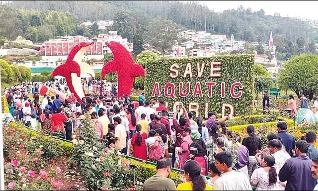 இந்த கண்காட்சியில் 2 லட்சம் ரோஜா மலர்களை கொண்டு கடல்வாழ் உயிரினங்களை பாதுகாப்பது குறித்த அலங்காரங்கள் தத்ரூபமாக வடிவமைக்கப்பட்டு காட்சிப்படுத்தப்பட்டு உள்ளது. குறிப்பாக 80 ஆயிரம் மலர்களை கொண்டு இரட்டை டால்பின், சிப்பிக்குள் முத்து, கடற்குதிரை, பென்குயின்கள், ஆமை, வண்ண மீன், நீலத்திமிங்கலம், பப்பர் பிஷ் போன்ற அலங்காரங்கள் இடம்பெற்று உள்ளன. இது சுற்றுலா பயணிகளின் கண்களுக்கு விருந்து படைக்கிறது.