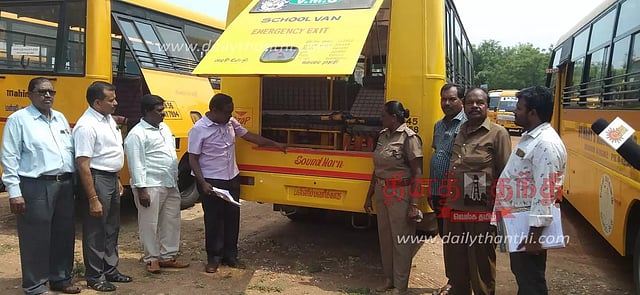 அப்போது சில பள்ளிக்கூடங்களின் பஸ்கள் சரிவர பராமரிக்கப்படாததால் 10-க்கும் மேற்பட்ட வாகனங்களை திருப்பி அனுப்பினார்கள். மேலும் அந்த பழுதுகளை பள்ளிக்கூடங்கள் திறப்பதற்கு முன்பு சரி செய்ய வேண்டும் எனவும் கேட்டுக் கொண்டனர். மேலும் 304 டிரைவர்களுக்கு கண் பரிசோதனை மற்றும் மருத்துவ பரிசோதனையும் செய்யப்பட்டது.