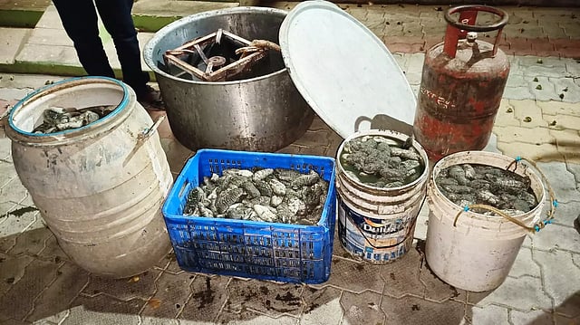 ராமநாதபுரம் அருகே தேவிபட்டினம் கடற்கரை பகுதியில் கடல் அட்டை பதுக்கி வைத்திருப்பதாக வனத்துறையினருக்கு தகவல் கிடைத்தது. இதை தொடர்ந்து ராமநாதபுரம் வனச்சரகர் திவ்யா தலைமையில் வனத்துறையினர் அங்கு சென்று அதிரடி சோதனை நடத்தினர். அப்போது தேவி பட்டினம் சித்திக் என்பவரின் வீட்டில் கடல் அட்டைகளை அவித்து கொண்டிருந்ததை வனத்துறையினர் கைப்பற்றினா. சுமார் 150 கிலோ எடையுள்ள கடல் அட்டைகளை கைப் பற்றிய வனத்துறையினர் இது தொடர்பாக முள்ளிமுனை பகுதியை சேர்ந்த செய்யது என்பவரின் மகன் நைனார் முகம்மது (வயது 52) என்பவரை பிடித்து விசாரித்து வருகின் றனர். இந்த கடல் அட்டை பிடிபட்டது தொடர்பாக தேவிபட்டினம் சித்திக் என்பவரை வனத்துறையினர் தேடி வருகின்றனர்.