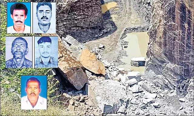 12 தொழிலாளர்கள் அங்கிருந்து ஓடிவிட்டனர். மற்ற 6 பேர் மீதும் ராட்சத பாறைகள் உருண்டு விழுந்து நசுக்கின. தொடர்ந்து அந்த பாறைகளின் மீதும் மேலும் சில பாறைகள் உருண்டு விழுந்ததால் அவர்கள் பாறைகளுக்குள் முழுவதுமாக புதைந்தனர். மேலும் பொக்லைன் எந்திரங்கள் மீதும் பாறைகள் விழுந்து அவற்றை மூழ்கடித்தன.