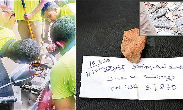 அந்த சீட்டில் 'இந்த வண்டியின் உள்ளே பாம்பு உள்ளது' என்று எழுதி வைக்கப்பட்டுள்ளது. அதோடு வாகனத்தின் பதிவு எண்ணும், தேதி மற்றும் நேரமும் குறிப்பிடப்பட்டு இருக்கிறது. அத்துடன் அந்த துண்டுச்சீட்டு பறக்காமல் இருக்க அதன் மீது ஒரு சிறிய கல்லையும் யாரோ ஒருவர் வைத்துவிட்டு சென் றுள்ளார் என்று கூறினார்.