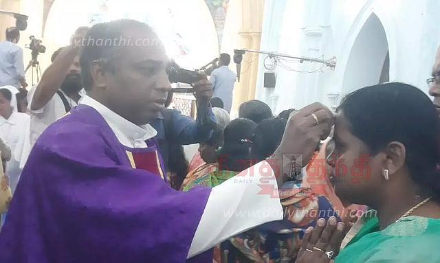 வேளாங்கண்ணி பேராலயத்தில் சாம்பல் புதனையொட்டி நேற்று காலை 6 மணிக்கு பேராலய பங்குத்தந்தை அற்புதராஜ் தலைமையில் சிறப்பு திருப்பலி நடைபெற்றது. திருப்பலியின் போது கடந்த ஆண்டு குருத்தோலை பவனியின்போது பயன்படுத்தப்பட்ட குருத்தோலைகளை எரித்து உருவாக்கப்பட்ட சாம்பலை கிறிஸ்தவர்கள் நெற்றியில் சிலுவை அடையாளமாக பங்கு தந்தையர்கள் பூசி ஆசிர்வாதம் செய்தனர்.