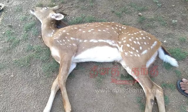 சமயபுரம் அருகே உள்ள இருங்களூரில் நேற்று காலை வனப்பகுதியில் இருந்து தப்பி வந்த புள்ளிமான் ஒன்று சுற்றித்திரிந்தது. இந்நிலையில், அப்பகுதியில் சுற்றித்திரிந்த நாய் ஒன்று புள்ளிமானை துரத்திச்சென்று கழுத்து பகுதியில் கடித்தது. இதைக்கண்ட அப்பகுதியில் இருந்தவர்கள் நாயை விரட்டி மானை மீட்டனர். பின்னர் இது குறித்து ஊராட்சி நிர்வாகம் மற்றும் வனத்துறையினருக்கு தகவல் தெரிவித்தனர். இதைத்தொடர்ந்து அங்கு வந்த கால்நடை மருத்துவர்கள் மானை பரிசோதனை செய்தபோது, மான் இறந்துவிட்டது தெரியவந்தது. இதைத்தொடர்ந்து மானை உடற்கூறு பரிசோதனை செய்த பின்னர், ஊராட்சி தலைவர் வின்சென்ட் தலைமையில் ஊராட்சி பணியாளர்கள் அந்த பகுதியில் மானின் உடலை புதைத்தனர்.
