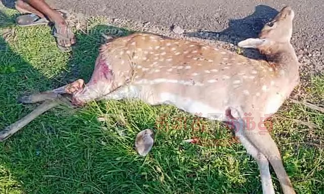 விருதுநகர்-சிவகாசி ரோட்டில் குமாரலிங்காபுரம் அருகே உள்ள தனியார் என்ஜினீயரிங் கல்லூரி முன்பு புள்ளிமான் ஒன்று வாகனத்தில் அடிபட்டு உயிரிழந்தது. சாலையை கடக்கும் போது வாகனத்தில் அடிபட்டு இருக்கலாம் என கருதப்படுகிறது. இறந்த மானின் உடல் வனத்துறையிடம் ஒப்படைக்கப்பட்டது. வனத்துறையினர் மானின் உடலை கைப்பற்றி உடற்கூறு ஆய்விற்குபின் புதைத்தனர்.