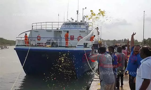 நாகையில் இருந்து இலங்கை காங்கேசன் துறைமுகத்துக்கு பயணிகள் கப்பல் போக்குவரத்து சேவை தொடங்க இரு நாடுகள் இடையே புரிந்துணர்வு ஒப்பந்தம் கையெழுத்தானது. இந்த சேவைக்காக இந்திய கப்பல் போக்குவரத்து கழகத்தின் சார்பில் பயணிகள் கப்பல் கட்டும் பணி நடந்து வந்தது. இதையடுத்து இந்த கப்பல் கொச்சியில் இருந்து புறப்பட்டு இலங்கை வழியாக நேற்று மாலை 5 மணிக்கு நாகைக்கு வந்தது. நாகை துறைமுகத்தை வந்தடைந்த கப்பலுக்கு துறைமுக அதிகாரிகள், ஊழியர்கள், பொதுமக்கள் மலர் தூவி வரவேற்பு அளித்தனர்.