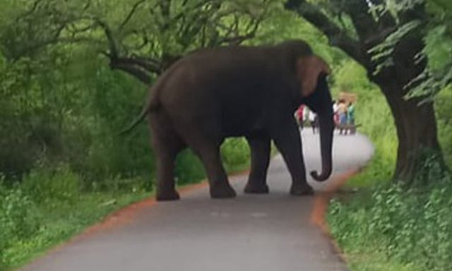 அந்த வழியாக வாகனங்களில் சென்றவர்களை கடந்து செல்ல விடாமல் பார்வையால் மிரட்டியது. பல மணி நேரமாக சாலையிலேயே நின்று கொண்டிருந்ததால், அந்த வழியாக மலைவாழ் மக்களின் போக்குவரத்து முற்றிலுமாக தடைபட்டது. நகராமல் சாலையில் நின்று கொண்டிருந்த யானையுடன், தூரமாக நின்று சிலர் தங்களது செல்போன்களில் செல்பி எடுத்துக் கொண்டனர்.