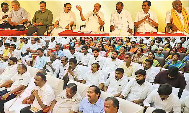 பா.ம.க சார்பில் 'சமூக நீதி காக்க சாதிவாரி கணக்கெடுப்பு' என்ற தலைப்பிலான கருத்தரங்கம் சென்னை தி.நகரில் உள்ள சர்.பி.டி தியாகராயர் அரங்கில் நேற்று நடந்தது. பா.ம.க தலைவர் அன்புமணி ராமதாஸ் தலைமையில் நடைபெற்ற இந்த கருத்தரங்கில், பா.ம.க நிறுவனர் ராமதாஸ், முன்னாள் மத்திய மந்திரி சுதர்சன் நாச்சியப்பன், தமிழ்நாடு அரசின் முன்னாள் அரசு வக்கீல் மாசிலாமணி, இந்திய கடல்சார் பல்கலைக்கழகத்தின் முன்னாள் துணைவேந்தர் அசோக் வரதன் ஷெட்டி, பா.ம.க கவுரவ தலைவர் ஜி.கே.மணி, முன்னாள் மத்திய மந்திரி ஏ.கே.மூர்த்தி, வக்கீல் பாலு, வன்னியர் சங்க தலைவர் அருள்மொழி உள்பட பலர் பங்கேற்றனர்.
