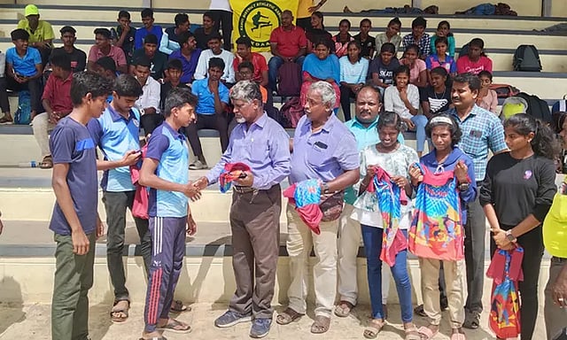இவர்களை மாநில அளவிலான போட்டிக்கு அனுப்பிவைக்கும் நிகழ்ச்சி நேற்று கரூர் திருவள்ளுவர் மைதானத்தில் நடைபெற்றது. இதற்கு கரூர் மாவட்ட தடகள சங்க செயலாளர் பெருமாள் தலைமை தாங்கினார். சிறப்பு அழைப்பாளராக முன்னாள் சர்வதேச தடகள வீரர் விஜயகுமார் கலந்து கொண்டு வீரர்களுக்கு டீ-சர்ட் வழங்கி, வாழ்த்து தெரிவித்தார்.