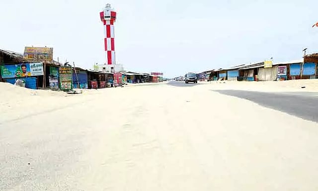 ராமேசுவரம் அருகே புயலால் அழிந்துபோன தனுஷ்கோடி கடல் பகுதி உள்ளது. இயற்கையாகவே தனுஷ்கோடி கடல் பகுதியில் கடல் சீற்றம் மற்றும் நீரோட்டம் உள்ள பகுதியாகும். தனுஷ்கோடி பகுதியில் கடல் சீற்றமாக இருப்பதும், பலத்த சூறாவளி காற்று வீசுவதையும் அவ்வப்போது காண இயலும். இந்த நிலையில் ராமேசுவரம் அருகே உள்ள தனுஷ்கோடி பகுதியில் கடந்த சில வாரங்களுக்கு முன்பு தொடர்ந்து பலத்த சூறாவளி காற்று வீசியது. இதனால் தனுஷ்கோடி எம்.ஆர்.சத்திரம் கடற்கரையில் இருந்து அரிச்சல்முனை வரை உள்ள இடைப்பட்ட தேசிய நெடுஞ்சாலையை பல இடங்களில் மணல் மூடியுள்ளது.