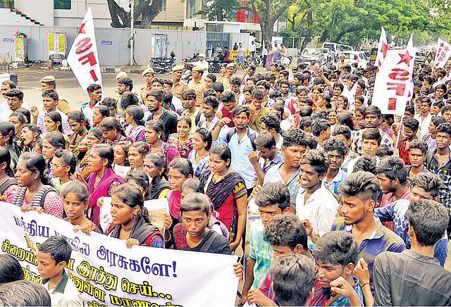 சென்னை ராஜரத்தினம் மைதானத்தில் இருந்து ஊர்வலமாக புறப்பட்ட மாணவர் சங்கத்தினர், புதுப்பேட்டை ஆதித்தனார் சாலை வழியாக சென்று கொண்டு இருந்தனர். போலீசார் அவர்களை தடுத்து நிறுத்தினர். அப்போது மாணவர்கள் போலீசாரிடம் வாக்குவாதத்தில் ஈடுபட்டு சாலைமறியலில் ஈடுபட்டனர்.