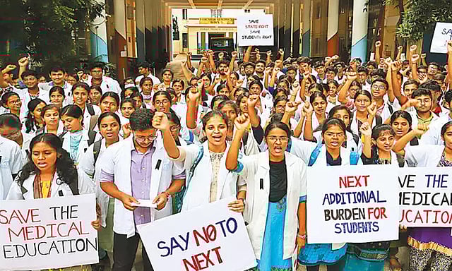 இந்த நிலையில், நெக்ஸ்ட் தேர்வுக்கு தமிழகம் முழுவதும் உள்ள மருத்துவ கல்வி பயிலும் மாணவர்கள் எதிர்ப்பு தெரிவித்து வருகின்றனர். பல்வேறு இடங்களில் ஆர்ப்பாட்டத்தை தொடங்கியுள்ளனர். அந்த வகையில், ஸ்டான்லி அரசு மருத்துவ கல்லூரியில் நேற்று 100-க்கும் மேற்பட்ட மருத்துவ மாணவர்கள் நெக்ஸ்ட் தேர்வுக்கு எதிர்ப்பு தெரிவித்து சட்டையில் கருப்பு பட்டை அணிந்து ஆர்ப்பாட்டத்தில் ஈடுபட்டனர்.