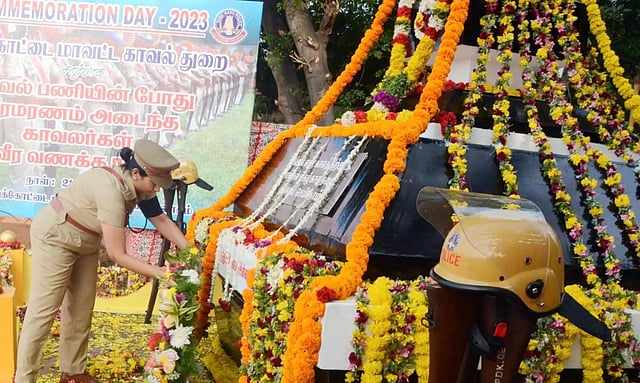 இதையொட்டி புதுக்கோட்டை ஆயுதப்படை மைதானத்தில் அமைக்கப்பட்டுள்ள நினைவு ஸ்தூபியில் அஞ்சலி செலுத்தும் நிகழ்ச்சி நேற்று நடைபெற்றது. மாவட்ட போலீஸ் சூப்பிரண்டு வந்திதா பாண்டே தலைமை தாங்கி மலர் வளையம் வைத்து, துப்பாக்கி குண்டுகள் முழங்க அஞ்சலி செலுத்தினார். மேலும் போலீசார் வீர வணக்கம் செலுத்தினர். இந்நிகழ்ச்சியில் போலீசார் பலர் கலந்து கொண்டனர்.