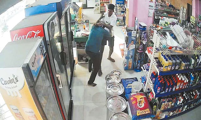 நேற்று காலை இவரது சூப்பர் மார்க்கெட்டுக்கு வந்த பா.ம.க.வைச் சேர்ந்த ஊனமாஞ்சேரி ஊராட்சி மன்ற தலைவர் மகேந்திரனின் மகன் சந்திரகாசன், கடையில் இருந்த ஜெயக்குமாரை கையால் சரமாரியாக தாக்கினார். மேலும் ஜெயக்குமாரை கடையிலிருந்து வெளியே இழுத்து வந்து போட்டு கடை வாசலிலும் தாக்கிவிட்டு மோட்டார் சைக்கிளில் சென்று விட்டார்.