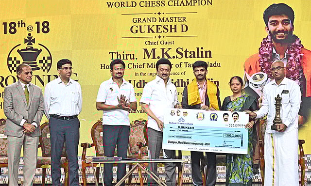 இந்த நிலையில், உலக செஸ் சாம்பியன் பட்டம் வென்ற குகேஷுக்கு தமிழக அரசு சார்பில் சென்னை கலைவாணர் அரங்கில் பாராட்டு விழா நடைபெற்றது. அப்போது குகேஷுக்கு ரூ.5 கோடிக்கான காசோலையை முதல்-அமைச்சர் மு.க.ஸ்டாலின் வழங்கினார். தொடர்ந்து வெற்றிக்கோப்பையை முதல்-அமைச்சரிடம் வழங்கி வாழ்த்து பெற்றார் குகேஷ்.