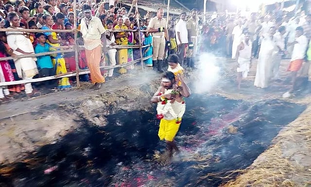 இதையொட்டி 200-க் கும் மேற்பட்ட பக்தர்கள் ஈரத்துணியுடன் கோவிலை சுற்றி வந்து, பக்தி பரவசத்துடன் பூக்குழி இறங்கி நேர்த்திக்கடன் செலுத்தினர். சில பக்தர்கள், தங்களது கைக்குழந்தைகளை தோளில் சுமந்தபடி பூக்குழி இறங்கியது நெகிழ்ச்சியை ஏற்படுத்தியது.