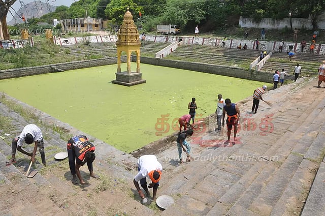 இந்த நிலையில், கிருஷ்ணகிரி மாவட்ட இந்து முன்னணி சார்பில், இக்கோவில் குளத்தை சுத்தம் செய்யும் பணியை நேற்று மேற்கொண்டனர். இந்து முன்னணி மாவட்ட தலைவர் கலைகோபி தலைமையில் நடந்த பணியில் 50-க்கும் மேற்பட்டவர்கள் ஈடுபட்டனர். இவர்கள் குளத்தின் படிக்கட்டில் வளர்ந்துள்ள செடிகளை அகற்றி, குப்பை மற்றும் மதுபாட்டில்களை சுத்தம் செய்தனர். மேலும் குளத்தைச் சுற்றிலும் வெள்ளை அடித்து அழகுபடுத்தி, இங்கு மாமிசம் சாப்பிடக்கூடாது என்றும், மது அருந்தக்கூடாது என்றும் அறிவிப்பு பலகை வைத்தனர்.