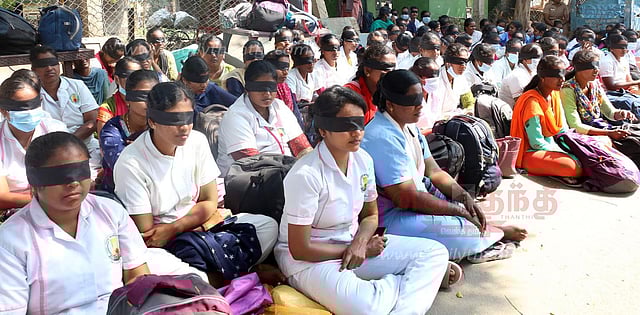 இதைத்தொடர்ந்து தற்காலிக நர்சுகள் சேலம் அரசு ஆஸ்பத்திரி புறநோயாளிகள் பிரிவு கட்டிடம் எதிரே உள்ள சாலையில் அமர்ந்து போராட்டம் நடத்தினர். அவர்களுடைய போராட்டம் நேற்று 3-வது நாளாக நீடித்தது. அப்போது நர்சுகள் கண்களில் கருப்பு துணி கட்டிக் கொண்டு இந்த போராட்டத்தில் ஈடுபட்டனர்.
