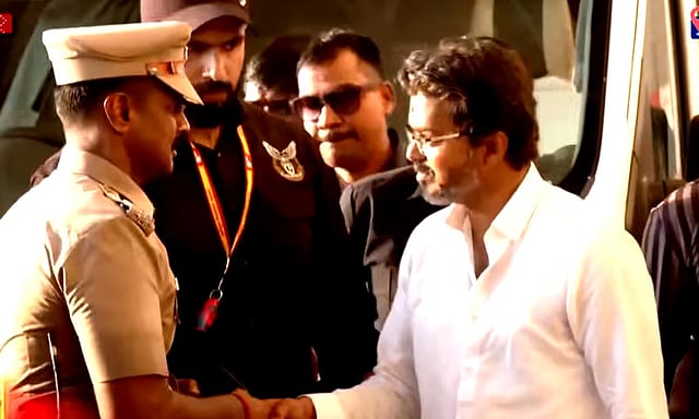 அசம்பாவித சம்பவங்கள் எதுவும் நடந்து விடாமல் இருக்க அவரது வாகனத்திற்கு முன்னாலும் ,பின்னாலும் போலீஸ் அதிகாரிகள் மற்றும் போலீசார் சுமார் 5 கி. மீ. தூரத்திற்கு ஓடியபடியே இருந்தனர். இந்த நிலையில், விஜய் சென்னை புறப்படும் போது விமான நிலையத்தில் போலீஸ் அதிகாரி ஒருவரிடம் கைகுலுக்கி சிறிது நேரம் பேசிவிட்டு சென்றார். திருச்சியில் உரிய போலீஸ் பாதுகாப்பு அளித்ததற்காக போலீசாருக்கு விஜய் நன்றி தெரிவித்து இருக்கலாம் எனத்தெரிகிறது.