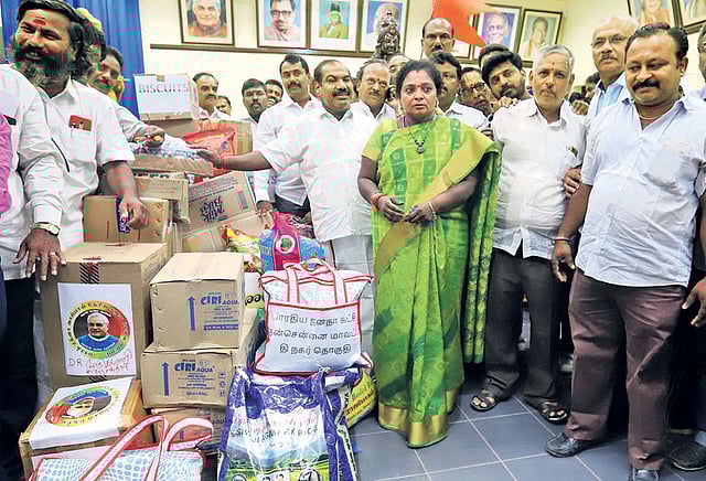 முன்னதாக தமிழக பா.ஜ.க. வில் உள்ள கூட்டுறவுத்துறை, திருவள்ளூர் கிழக்கு, சேப்பாக்கம்-திருவல்லிக்கேணி, மயிலாப்பூர், வேளச்சேரி, ஆயிரம்விளக்கு, சைதாப்பேட்டை, தியாகராயநகர், மாதவரம் உள்ளிட்ட மாவட்டங்கள்- மண்டலங்கள் சார்பில் நிதியாகவும், அரிசி, பிஸ்கெட், குடிநீர், மருந்துகள், நைட்டி உள்பட உடைகள் உள்ளிட்ட சேகரிக் கப்பட்ட நிவாரண பொருட் கள் தமிழிசை சவுந்தரராஜனிடம் வழங்கப்பட்டது.