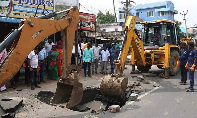 இதுகுறித்த தகவல் அறிந்ததும் நகரமன்ற தலைவர் தமிழ்ச்செல்வி, நகராட்சி ஆணையர் சுரேந்திரஷா மற்றும் தேசிய நெடுஞ்சாலைத்துறை அதிகாரிகள் அங்கு நேரில் சென்று பார்வையிட்டு ஆய்வு செய்தனர். பின்னர் சாலையில் பள்ளம் ஏற்பட்ட இடத்தை உடனடியாக சீரமைக்க நடவடிக்கை எடுக்கப்பட்டது. அதன்படி 2 பொக்லைன் எந்திரங்கள் அங்கு வரவழைக்கப்பட்டு சாலையில் பள்ளம் ஏற்பட்ட இடத்தை சுற்றிலும் 10 அடிக்கும் மேல் பள்ளம் தோண்டப்பட்டு வலுவான கட்டமைப்புடன் சீரமைப்பு பணிகள் தீவிரமாக நடைபெற்று வருகின்றன. இப்பணிகளை பார்வையிட்ட நகரமன்ற தலைவர் தமிழ்ச்செல்வி, பொதுமக்கள், வாகன ஓட்டிகள் பாதிக்காத வகையில் இப்பணிகளை விரைந்து முடிக்க வேண்டுமென அறிவுறுத்தினார்.