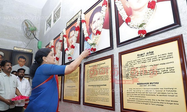 நேற்று தஞ்சையை அடுத்த முள்ளிவாய்க்கால் நினைவு முற்றத்தில் மொழிப்போர் தியாகிகளுக்கு வீரவணக்கம் செலுத்தும் நிகழ்ச்சியில் வி.கே.சசிகலா கலந்து கொண்டு மொழிப்போர் தியாகிகளின் படத்திற்கு மாலை அணிவித்து மலர் தூவி மரியாதை செலுத்தினார்,