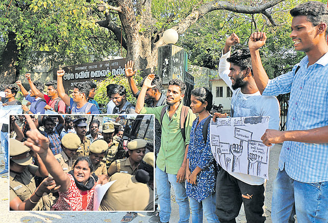 அவர்களை போலீசார் ஹாடவ்ஸ் சாலை அருகே தடுப்புவேலி அமைத்து தடுத்து நிறுத்தினார்கள். போலீசார் அமைத்த தடுப்பு வேலியையும் தாண்டி சாஸ்திரிபவனை பூட்டு போட முயற்சித்தவர்களை போலீசார் கைது செய்தனர். இதனால் சிறிது நேரம் பரபரப்பு ஏற்பட்டது.