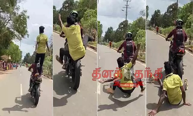 தற்போது மீண்டும் காரைக்குடியில் வாலிபர் மோட்டார் சைக்கிளில் சாகசம் செய்ய முயன்ற போது கீழே விழுந்து சென்ற சம்பவம் பெரும் அதிர்ச்சியளிக்கும் வகையில் உள்ளது. இந்த வீடியோவை வைத்து அழகப்பாபுரம் போலீசார் அந்த வாலிபர்களை தேடி வருகின்றனர். இதற்கிடையே இந்த சம்பவம் தொடர்பாக அழகப்பா போலீசார் விசாரணை நடத்தி அந்த கல்லூரி மாணவர்கள் 4 பேரையும் கண்டுபிடித்தனர். பின்னர் அவர்களை போலீஸ் நிலையத்திற்கு அழைத்து வந்து விசாரணை நடத்தினர். மேலும் அவர்கள் மீது வழக்குப்பதிவு செய்து விசாரணை நடத்தி வருகின்றனர்.