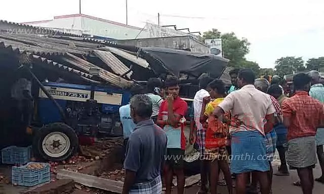 வத்திராயிருப்பு அருகே உள்ள நெடுங்குளத்தில் இருந்து டிராக்டரில் மணல் ஏற்றி சென்று கொண்டு இருந்தனர். அப்போது கோட்டையூர் அருகே செல்லும் போது அந்த வழியாக வந்த மினி வேன் மீது டிராக்டர் மோதியது. மோதிய வேகத்தில் டிராக்டர் காய்கறி கடைக்குள் புகுந்து கவிழ்ந்தது. இந்த விபத்தில் டிராக்டர் ஓட்டி வந்த ராம்குமார் (வயது 35), டிராக்டரில் வந்த அய்யாசாமி (40) ஆகிய 2 பேரும் காயம் அடைந்தனர். அவர்களை அருகில் இருந்தவர்கள் மீட்டு சிகிச்சைக்காக வத்திராயிருப்பு அரசு ஆஸ்பத்திரியில் சேர்த்தனர். டிராக்டர் மோதியதால் கடையின் முன்புற பகுதியும், காய்கறிகளும் சேதமடைந்தன. இதுகுறித்து வத்திராயிருப்பு போலீசார் வழக்குப்பதிவு செய்து விசாரணை நடத்தி வருகின்றனர். இந்த சம்பவம் அந்த பகுதியில் பரபரப்பை ஏற்படுத்தியது.