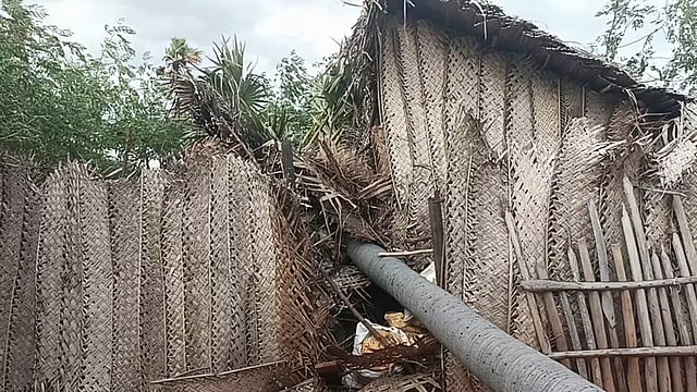 அப்போது எதிர்பாராத விதமாக சூறைக்காற்றுக்கு அருகிலுள்ள பனைமரம் வேரோடு சாய்ந்து அவரது குடிசை வீட்டின் மீது விழுந்தது. சுதாரித்து கொண்ட இருவரும் வீட்டிலிருந்து வெளியே ஓடி தப்பினர். ஆனால் வீடு பலத்த சேதமடைந்துள்ளது. இதுகுறித்து தகவல் அறிந்து சாத்தான்குளம் தாசில்தார் ரதிகலா பாதிக்கப்பட்ட குமார் வீட்டை பார்வையிட்டார்.
