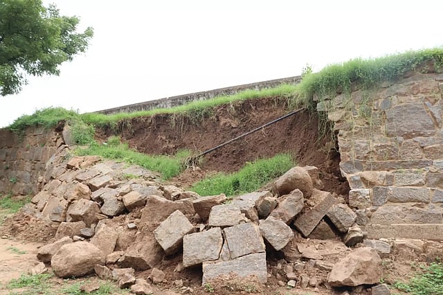 இதனால் பக்கவாட்டு சுற்றுச்சுவர்களில் மரங்களும் வளர்ந்து காணப்படுகிறது. கோட்டை கொத்தளம் கொடிக்கம்பம் அருகே அகழி சுற்றுப்பாதையில் உள்ள உட்புற பக்கவாட்டு சுவரில் கடந்த சில நாட்களுக்கு முன்பு பெய்த மழையின் காரணமாக இடிந்து விழுந்துள்ளது. கற்களால் கட்டப்பட்டுள்ள இந்த சுவர் மண் அரிப்பு காரணமாக கீழே விழுந்துள்ளது.