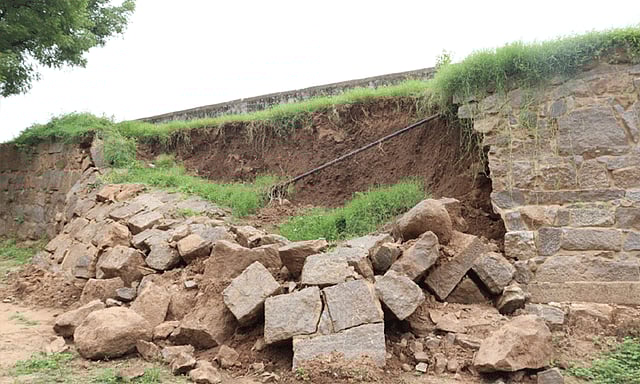 இதனால் பக்கவாட்டு சுற்றுச்சுவர்களில் மரங்களும் வளர்ந்து காணப்படுகிறது. கோட்டை கொத்தளம் கொடிக்கம்பம் அருகே அகழி சுற்றுப்பாதையில் உள்ள உட்புற பக்கவாட்டு சுவரில் கடந்த சில நாட்களுக்கு முன்பு பெய்த மழையின் காரணமாக இடிந்து விழுந்துள்ளது.