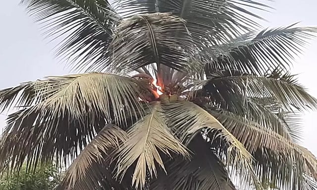பண்ருட்டி அருகே உள்ள புதுப்பேட்டை பகுதியில் நேற்று மாலை இடி மின்னலுடன் மழை பெய்தது. இதில் பொன்னங்குப்பம் கிராமத்தில் ஆண்கள், பெண்கள் என 10-க்கும் மேற்பட்ட தொழிலாளாகள் விவசாய வேலையில் ஈடுபட்டிருந்தனர். அப்போது திடீரெ மின்னல் தாக்கியதில் அருகில் நின்ற தென்னை மரம் தீப்பிடித்து எரிந்தது.