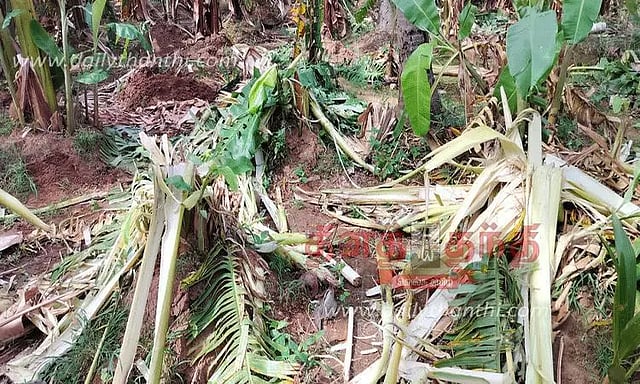 பின்னர் அந்த தோட்டத்துக்குள் புகுந்த யானைகள், அங்கிருந்த ஏராளமான வாழை, தென்னை மரங்களை சாய்த்து அட்டகாசத்தில் ஈடுபட்டன. இதில் பல லட்சம் ரூபாய் மதிப்பிலான வாழை, தென்னை மரங்கள் சேதமடைந்தன. இதனால் வேதனையடைந்த விவசாயிகள், காட்டு யானைகளால் சேதமடைந்த வாழை, தென்னைகளுக்கு உரிய இழப்பீடு வழங்க வேண்டும். வனவிலங்குகள் விளைநிலங்களுக்குள் புகாதவாறு வனத்துறையினர் உரிய நடவடிக்கை எடுக்க வேண்டும் என்று அரசுக்கு கோரிக்கை விடுத்தனர்.